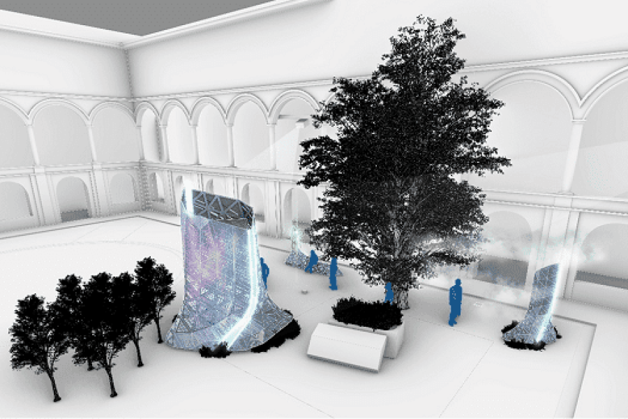 The installation’s structure is made up of a curated mix of both recycled and recyclable plastics. It is divided into three key components: a large-scale air purifier, a water mister, and a circadian lighting system. In essence, it calls to mind a huge tree. This was a deliberate move on the design team as it illustrates the bond between the natural world and modern technology.